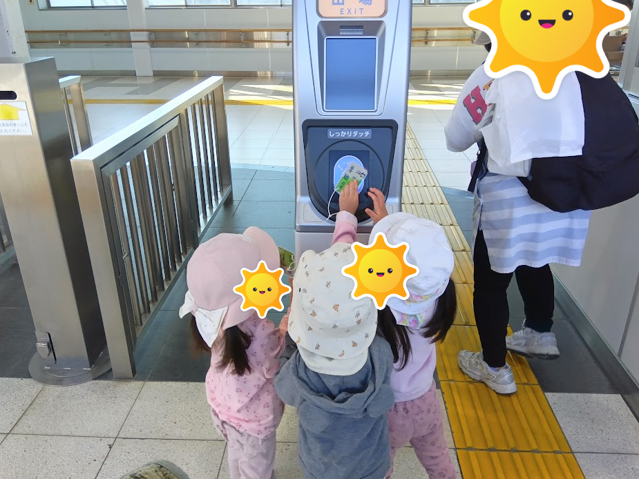 腕につけた保育士お手製の『Suica🍉〜すいか組バージョン〜』を真似っこで自動改札機に“ピッ!”とかざして入場です✨