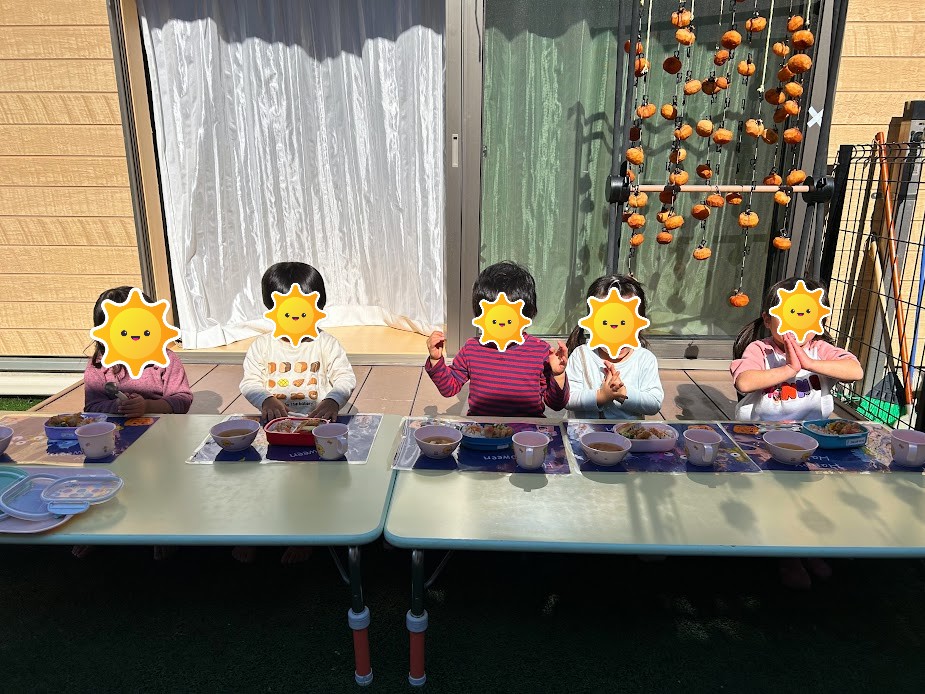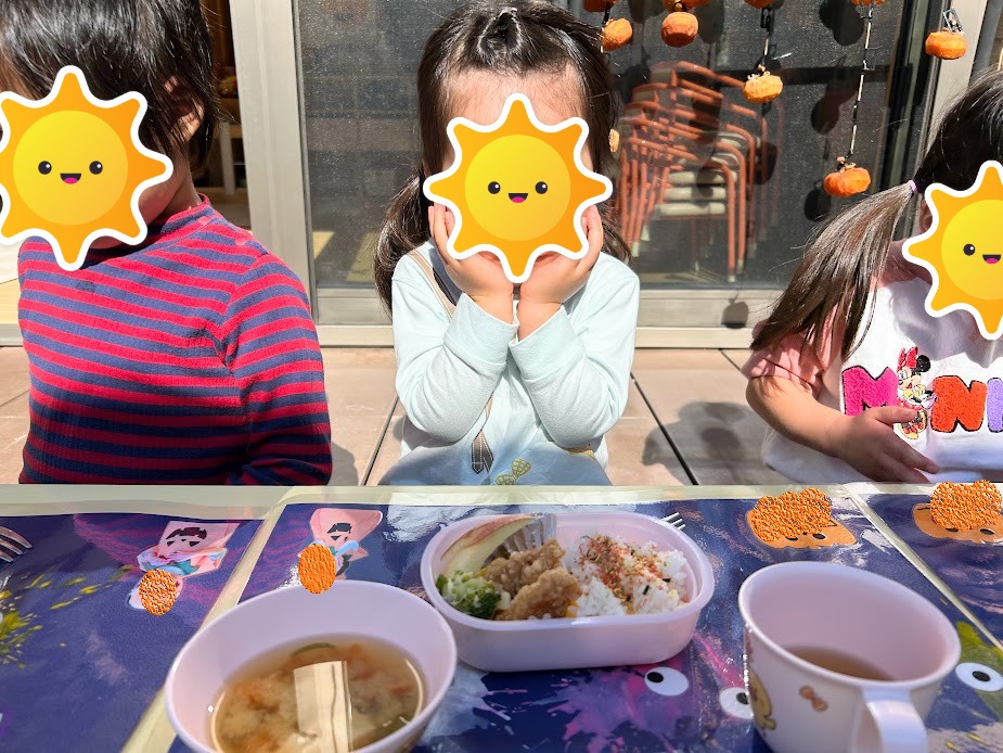 自分たちで作ったランチョマットでお弁当タイムin園庭🥄🙌